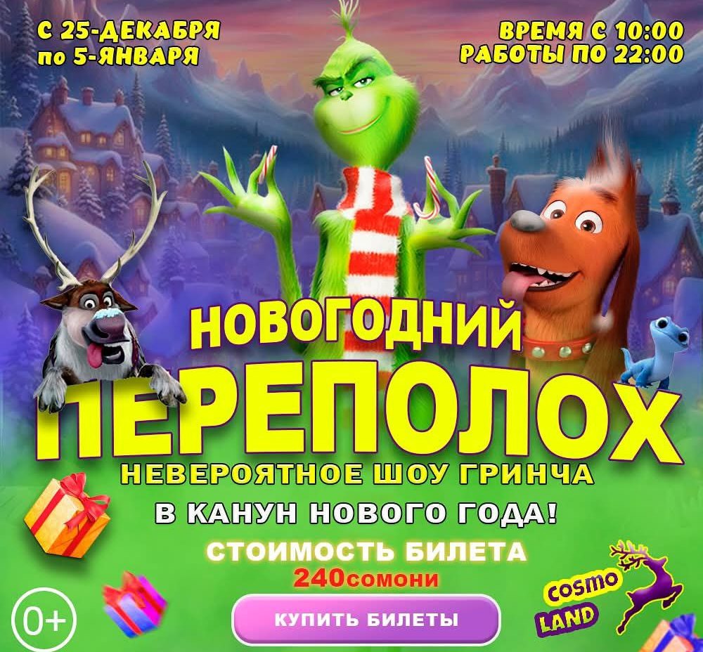 В детском развлекательном центре «Космолэнд» с 25 декабря по 5 января с 18:00 до 20:30 маленьких гостей ждёт настоящий новогодний переполох с участием Гринча – похитителя праздника!