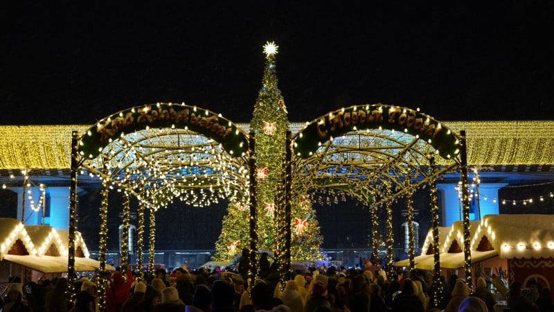 Она украшена разноцветными иллюминационными огнями и яркими новогодними игрушками, создавая волшебную атмосферу. Вокруг ёлки создан сказочный новогодний городок.