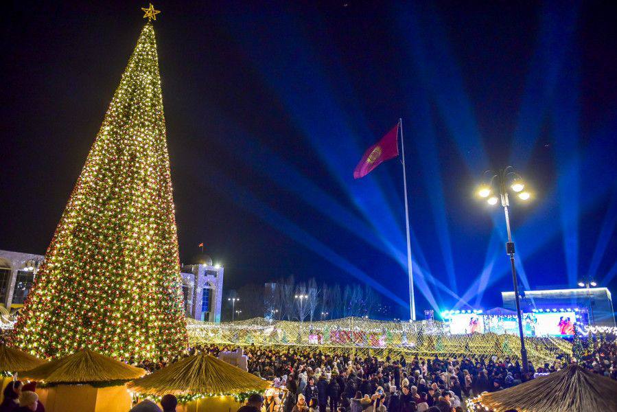На площади Ала-Тоо в Бишкеке 14 декабря 2024 года установили ёлку высотой 32 метра. Она украшена 4 тысячами игрушек и сверкающими гирляндами. Торжественное зажжение огней сопровождалось выступлениями кыргызских артистов и детских коллективов.