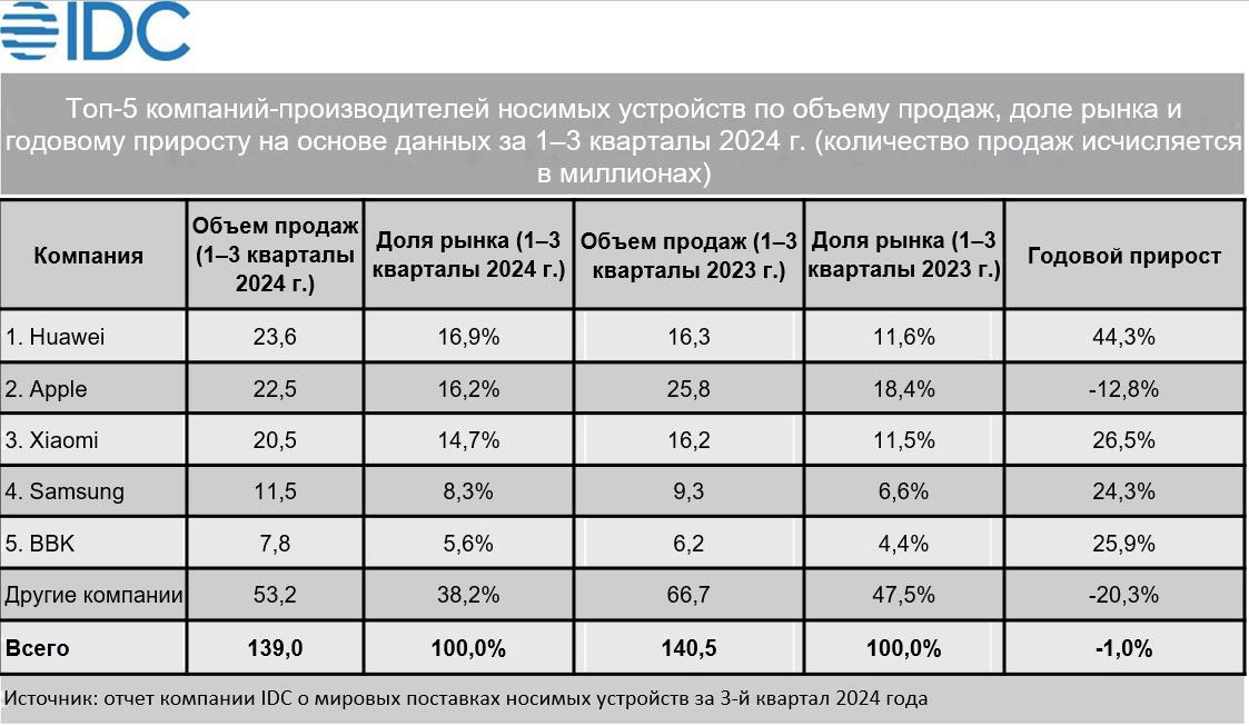 По данным отчета аналитической компании IDC, Huawei заняла первое место по объему международных поставок носимых устройств за первые три квартала 2024 года.