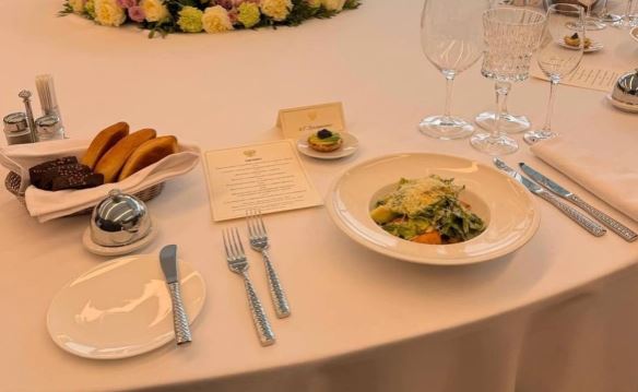 Участникам встречи предложили тарталетки с крабом, черной икрой и авокадо, салат с тигровыми креветками и манго. Кроме этого, на выбор были предложены ленивые вареники с уткой, бульон с говядиной и базиликом, томленый осетр и голубец с креветкой, цыпленок в сметане с картофелем и медальоны из мраморной говядины с ризотто из кедрового ореха.