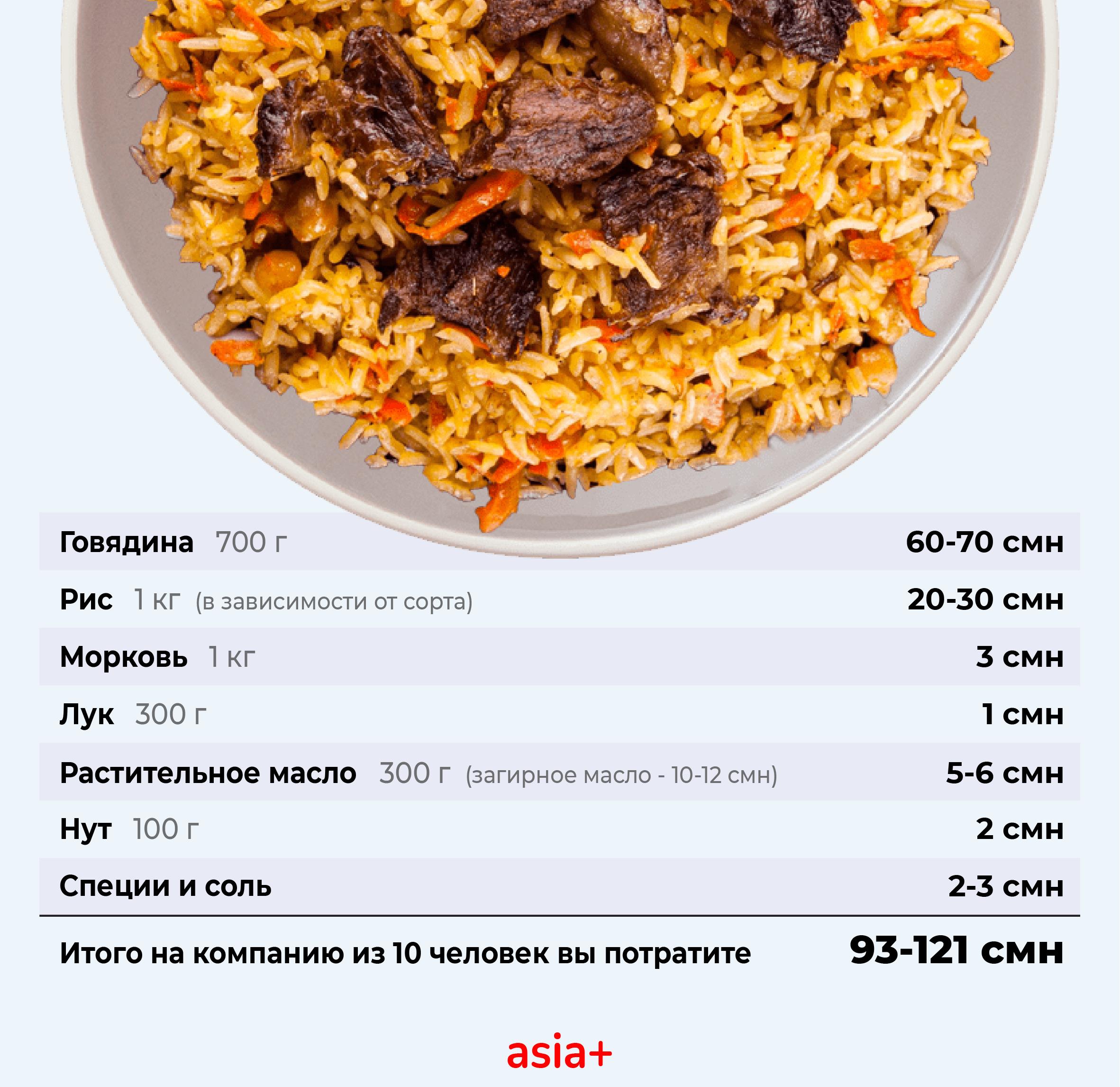 Цены ориентировочные, они могут меняться в зависимости от регионов и цен на ингредиенты. Например, килограмм риса стоит от 15 до 30 сомони в зависимости от сорта.