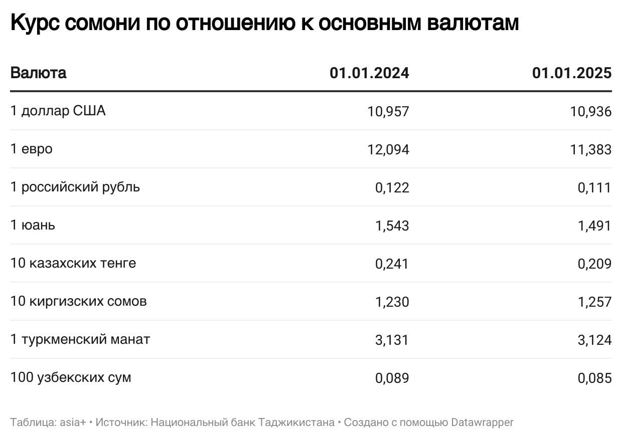 Согласно официальному курсу, ежедневно устанавливаемому Национальным банком Таджикистана, сомони в течение 2024 года укрепился на 0,2% к доллару США, на 5,9% к евро, на 3,2% к китайскому юаню и на 8,9% к российскому рублю.