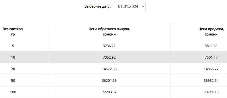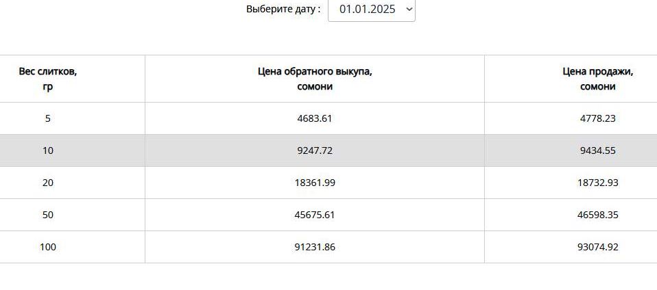 По данным НБТ, стоимость 5-граммового слитка в течение минувшего года повысилась на 966,5 сомони и на 1 января наступившего года составила 4,8 тыс. сомони. А 100-граммовый слиток подорожал на 19,3 тыс. сомони и в первый день 2025 года стоил 93,1 тыс. сомони.