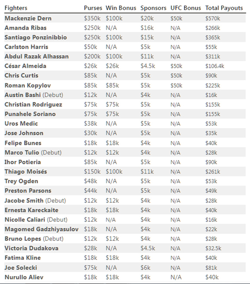 Портал Sporty Salaries обнародовал гонорары бойцов по итогам прошедшего шоу. Суммы указаны с учетом спонсорских выплат, выплат за платные трансляции и бонусов за «Бой вечера» и «Выступление вечера».