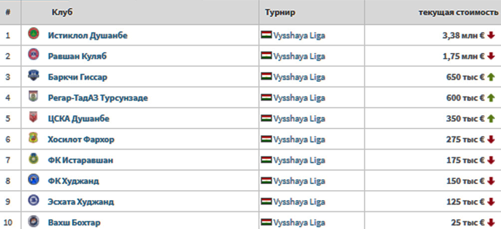 На сегодня самой дорогой командой остается «Истиклол» – 3,38 млн евро. На второе место поднялся кулябский «Равшан» – 1,75 млн. На третьем месте идет «Баркчи» из Гиссара – 650 тысяч евро.