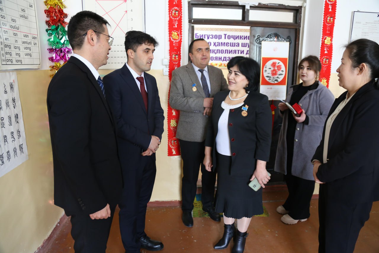Ху Бэньфу тоже вручил памятные подарки Мукаддас Алабердиён и Исфандиёру Ниёзову, а также передал колледжу «автоматический отрезной станок» в качестве учебного оборудования. Он выразил надежду, что это станет новой вехой для дальнейшего укрепления сотрудничества и совместной работы по развитию профессионального и культурного образования.