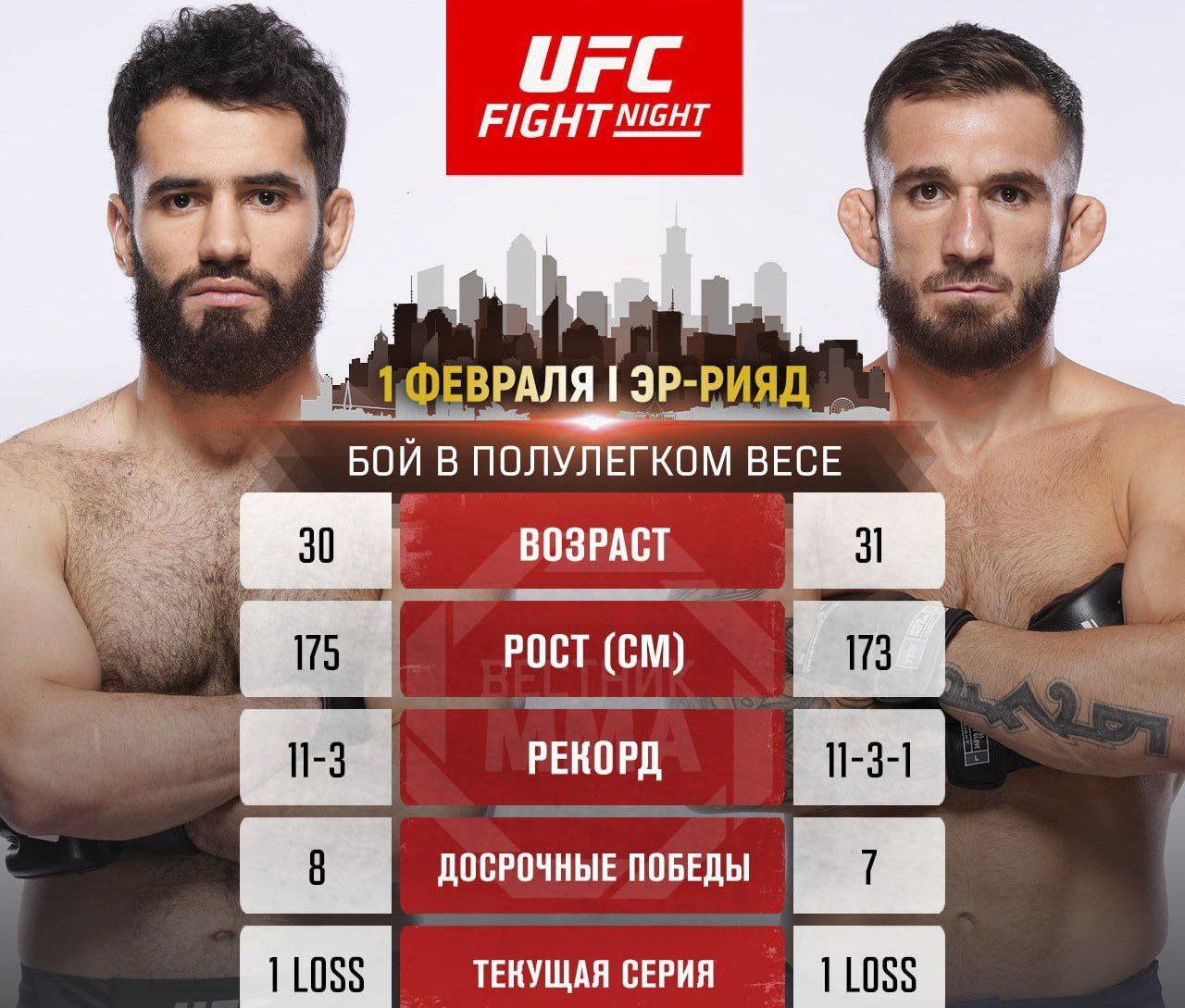 В Саудовской Аравии 1 февраля состоится очередной турнир UFC, в котором встретятся два бойца полулегкого веса – таджикистанец Мухаммад Наимов и австралиец Каан Офли.