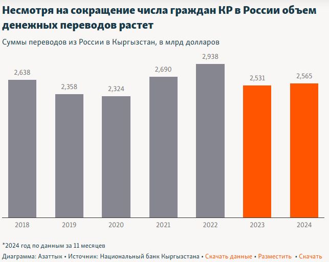 В 2023 году из России в Кыргызстан было переведено 2 миллиарда 531 миллион долларов.