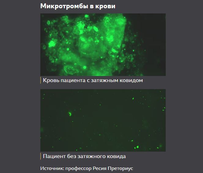 «При затяжном ковиде воспаление часто остается недиагностированным, потому что его пропускают на этапе тестирования», – объясняет профессор Преториус. По ее словам, примерно через две недели после заражения крошечные сгустки крови – те самые микротромбы – у большинства больных распадаются, и их кровь приходит в норму.