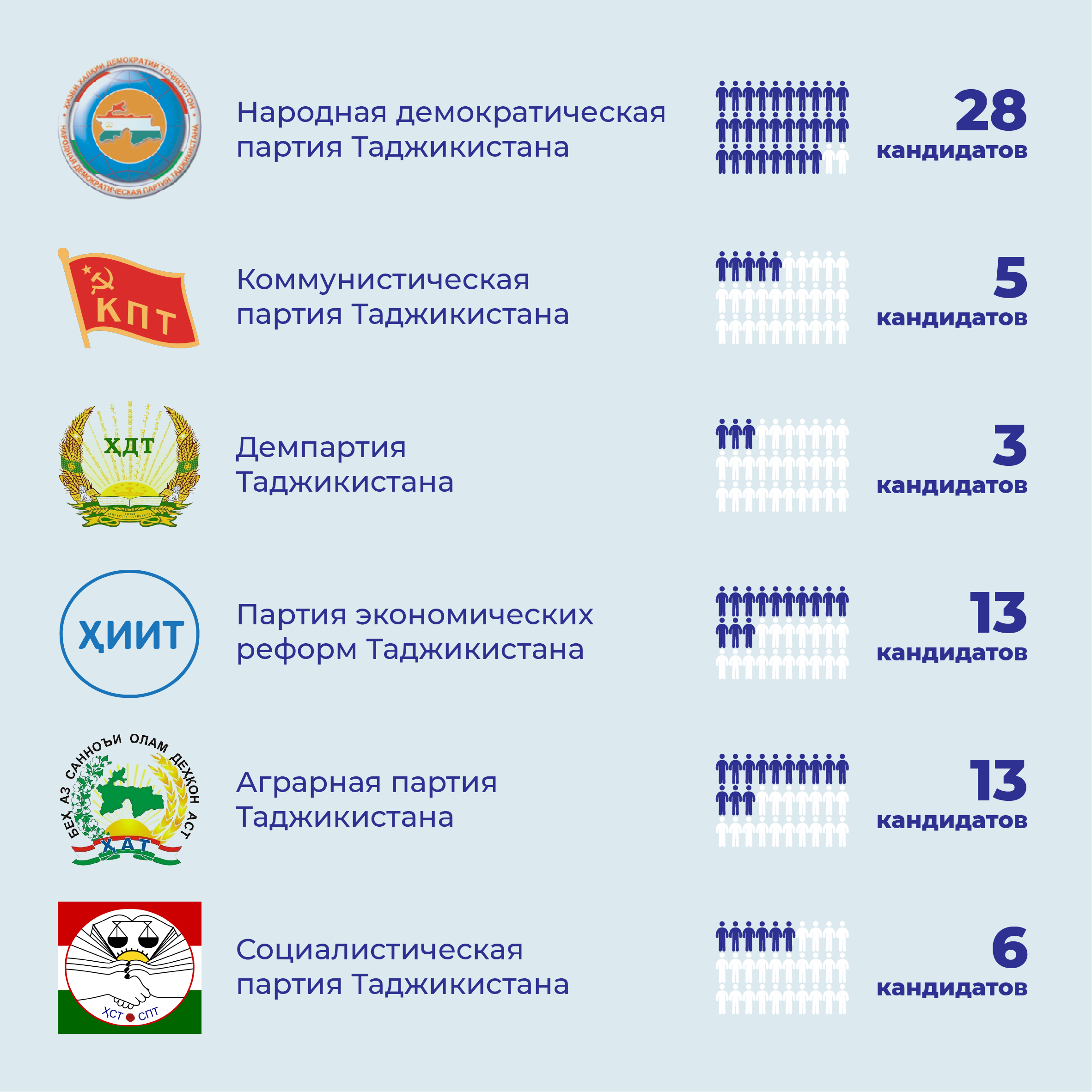 В настоящее время большая часть из 63 мест в парламенте принадлежит правящей партии – Народно-демократической партии Таджикистана (НДП).