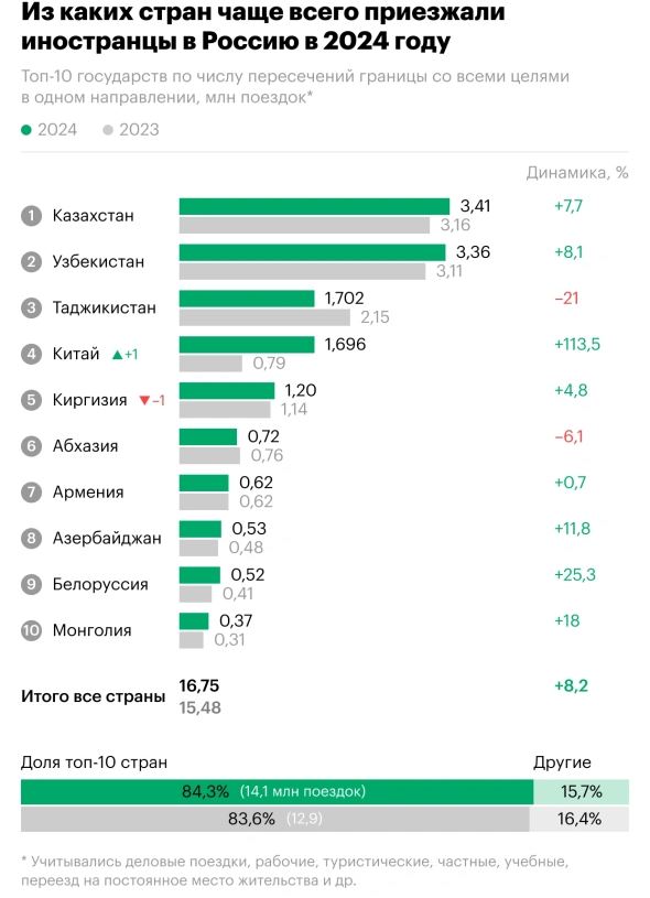 В 2024 году иностранцы так же, как и в прошлые годы, в основном приезжали из стран ближнего зарубежья. Лидерами по въезду стали граждане Казахстана – количество поездок оттуда выросло на 7,7% год к году, до 3,4 млн. Также чаще стали приезжать из Беларуси (+25% год к году).