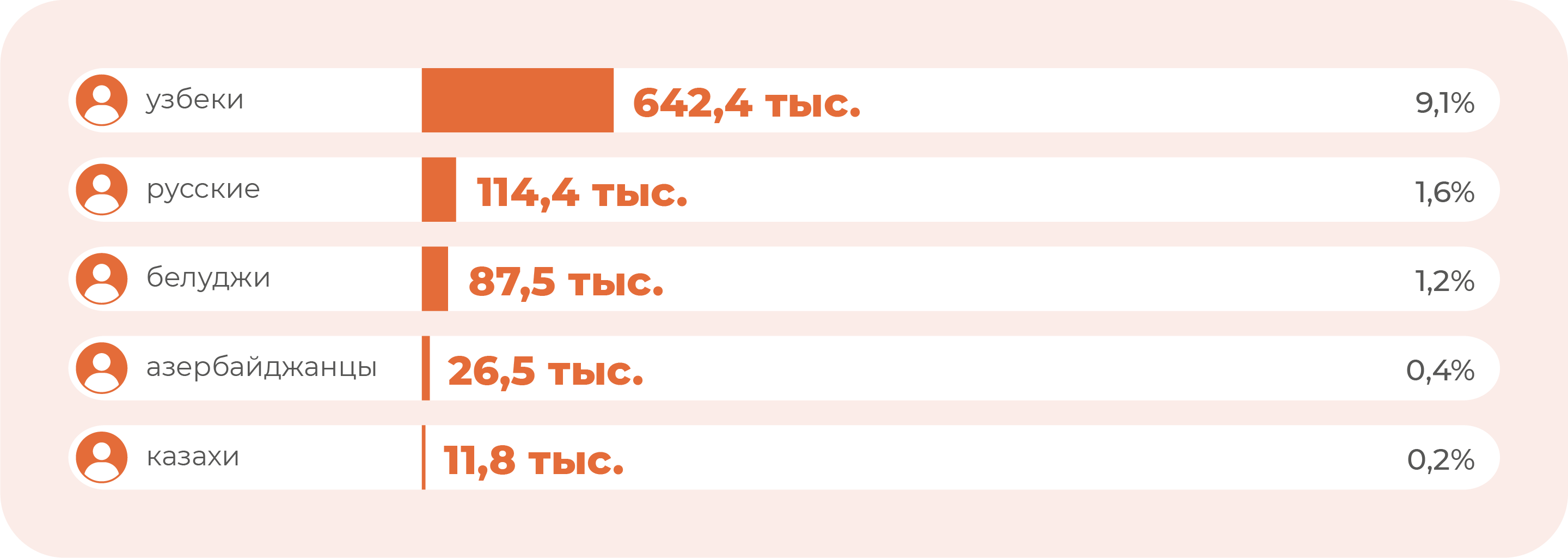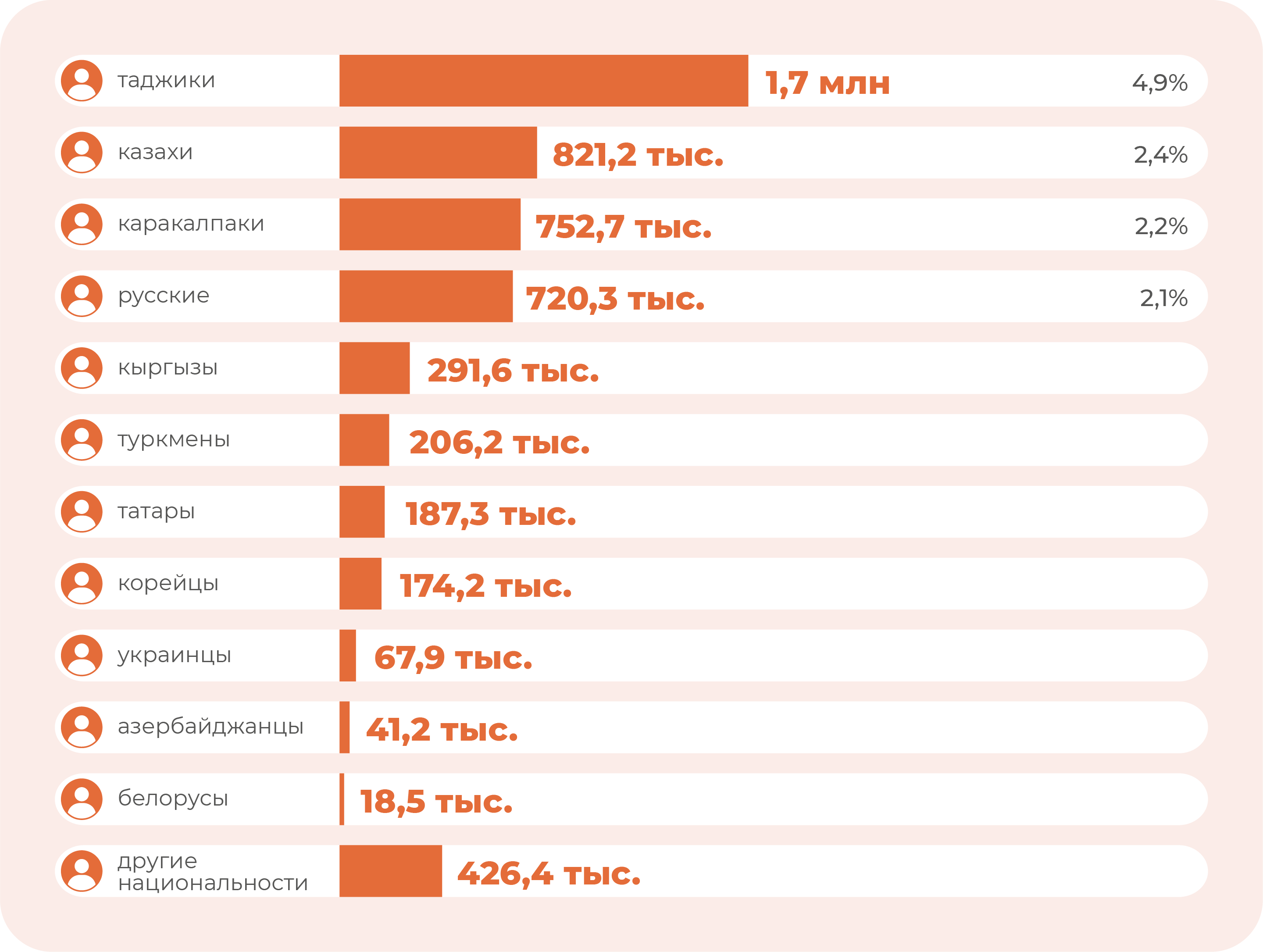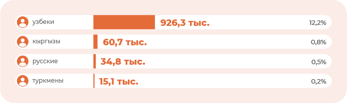 По состоянию на 1 января 2021 года (численность населения составляла 34,6 млн человек) узбеки составляли 84,4% населения – это 29,2 млн человек. Далее идут: