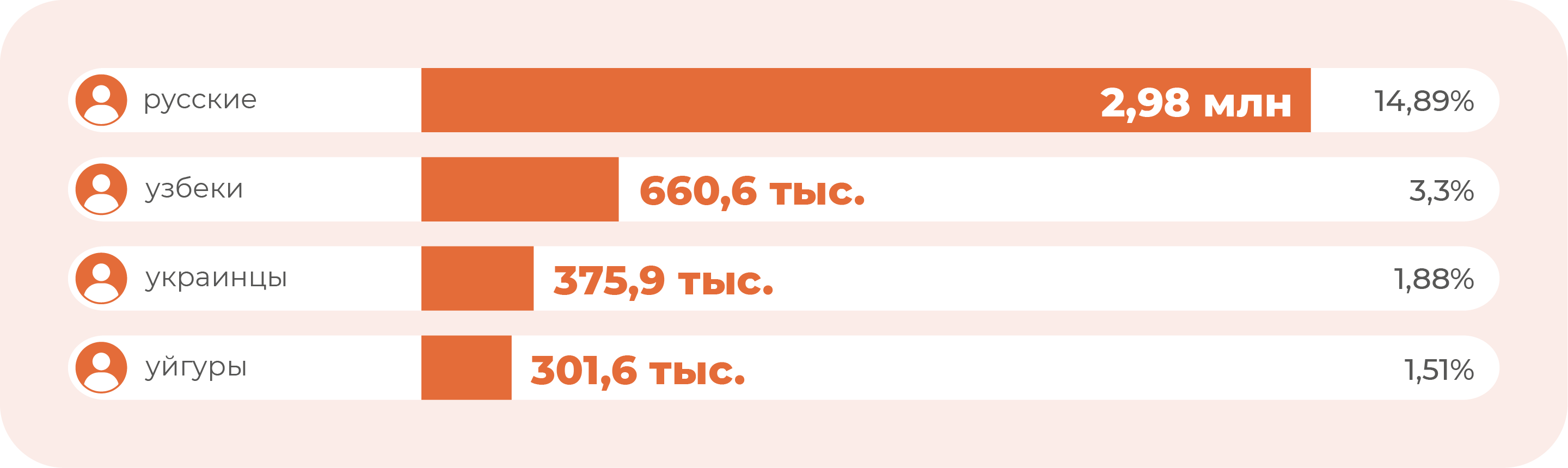 К началу 2024 года (численность населения составляла 20 033 546 человек) доля казахов в этническом составе достигла 70,98% – это 14,2 млн человек. Далее идут: