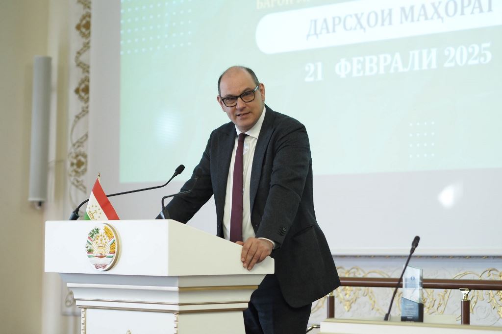Глава представительства ЕБРР в Таджикистане Хольгер Вифель в рамках мероприятия вручил награды руководству и сотрудникам «Амонатбанка» за успешное завершение программ «Планирование климатического перехода» и «Повышение кадрового потенциала», реализуемых при участии ЕБРР.