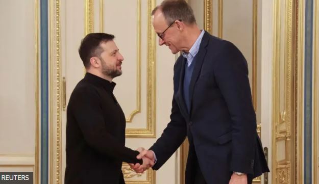 9 декабря Мерц во второй раз за войну приехал в Киев, заверил президента Зеленского, что по-прежнему всячески поддерживает Украину, а также сообщил, что предлагает создать новый альянс крупнейших европейских союзников Украины — или для начала хотя бы контактную группу — чтобы выработать общий взгляд на будущий мир в Украине.