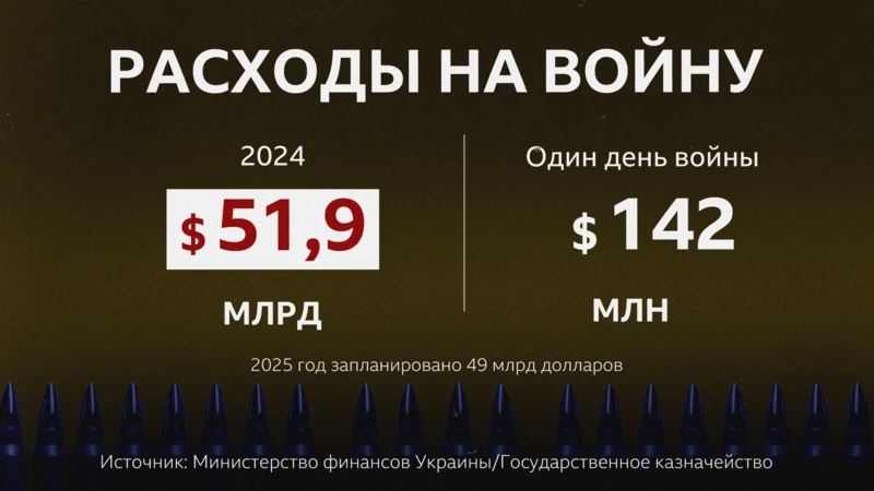 Как сообщили Украинской службе «Би-би-си» в Министерстве финансов Украины, за 2024 год бюджетные расходы на безопасность и оборону составили почти 2,1 трлн гривен ($51,9 млрд). То есть в среднем день войны стоил около 5,7 млрд гривен ($142 млн).