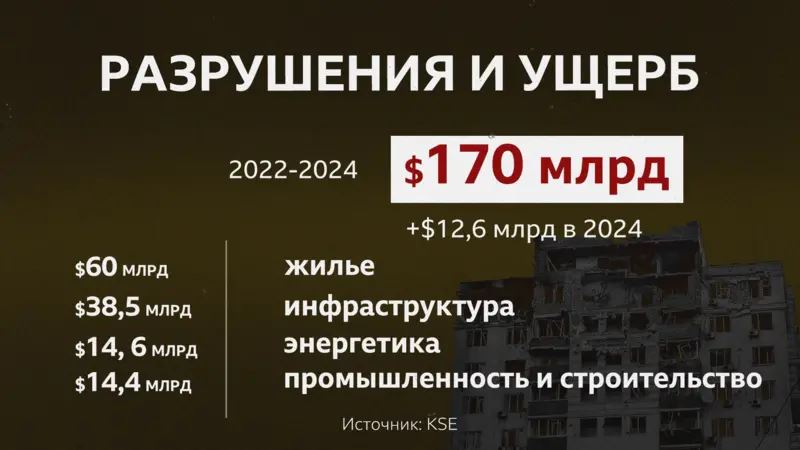 По подсчетам Киевской школы экономики (KSE), которая с начала российско-украинской войны ведет учет экономических потерь Украины, по состоянию на ноябрь 2024 года общая сумма прямого ущерба, нанесенная инфраструктуре страны, выросла до $170 млрд. На январь 2024 года эти потери оценивали в $155 млрд.