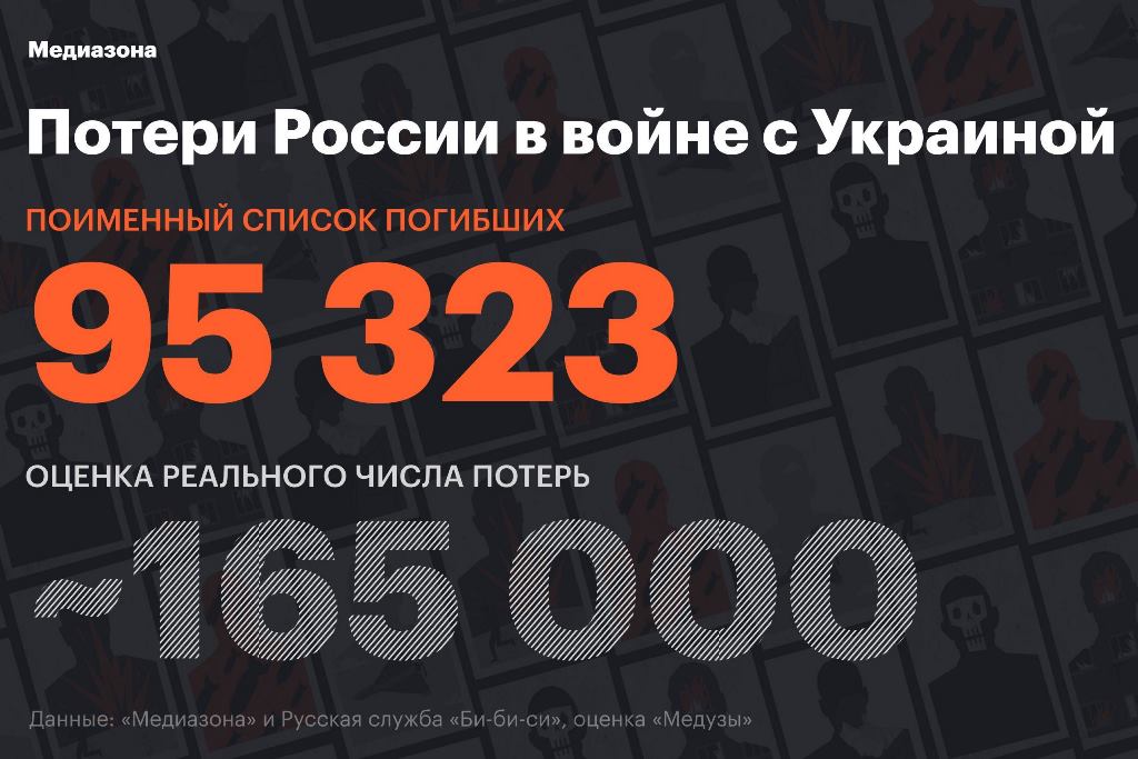 Между тем российские потери в войне с Украиной к концу 2024 года составили больше 165 тысяч человек убитыми, подсчитали «Медуза» и «Медиазона», изучив данные о потерях по поименному списку погибших и по реестру наследственных дел.