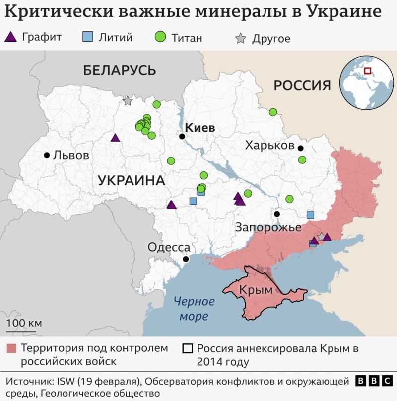 В Украине находятся огромные залежи редкоземельных и важнейших минералов, но многие из них расположены на территориях, контролируемых российскими войсками. По словам Трампа, Украина должна отдать эти ресурсы США, чтобы руководство страны продолжило поддерживать ее в войне против России.