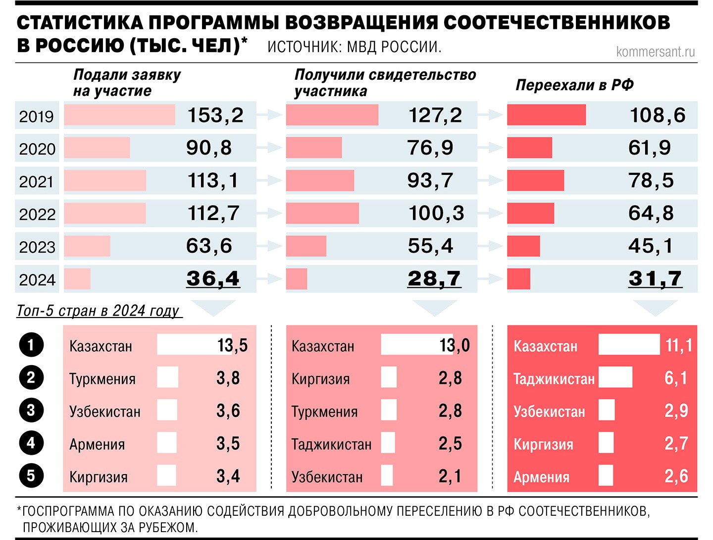 Органы МИДа и МВД получили заявки на участие в добровольном переселении от 36,4 тыс. человек. 31,7 тыс. граждан приехали в РФ и встали на учет в органы МВД (период между получением свидетельства участника программы и фактическим переездом может быть разным, иногда более года).
