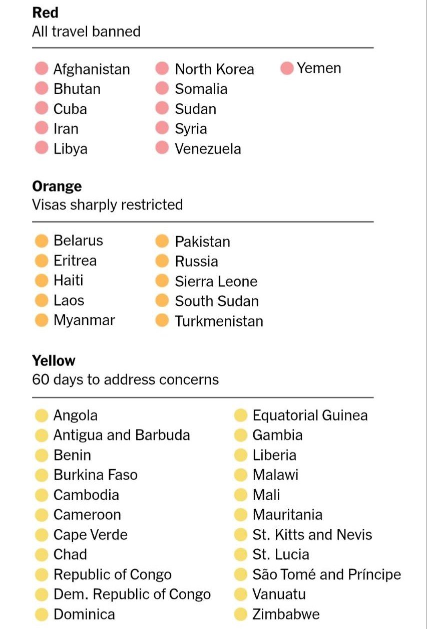Странам из «желтой» категории планируется дать 60 дней на устранение факторов, вызывающих «беспокойство» США, в противном случае каждая из них может попасть либо в категорию полного запрета, либо резкого ограничения выдачи виз. К категории отнесены 22 государства, в том числе Зимбабве, Чад, Сент-Китс и Невис, Вануату и другие.