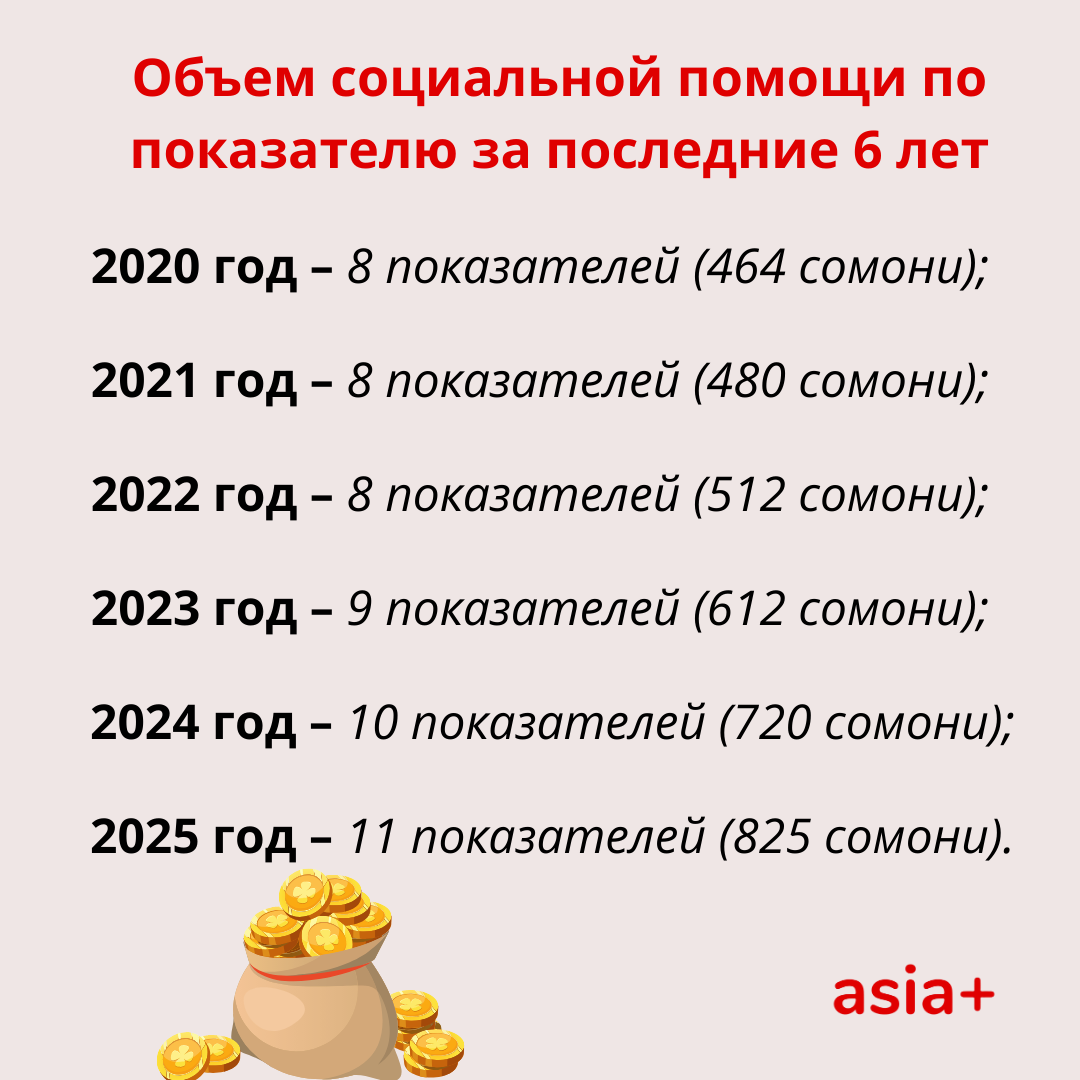 По словам Соимы Мухабатовой, в 2025 году размер АСП на одну семью составляет 11 показателей для расчета, что эквивалентно 825 сомони. Это пособие выплачивается раз в три месяца – четырьмя частями в течение года.