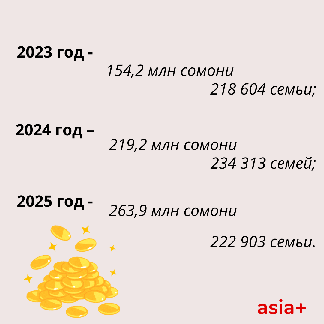 По словам Соимы Мухабатовой, в 2025 году размер АСП на одну семью составляет 11 показателей для расчета, что эквивалентно 825 сомони. Это пособие выплачивается раз в три месяца – четырьмя частями в течение года.