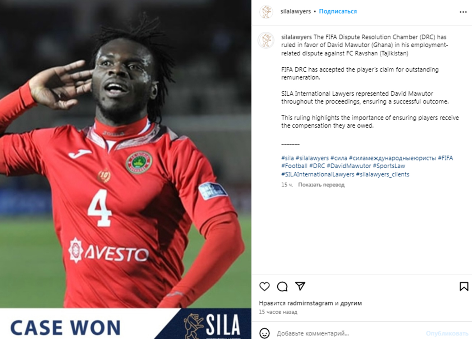 «Дело выиграно!» – сообщила на своей странице в Инстаграм юридическая компания SILA International Lawyers, которая занималась жалобой Дэвида Мавутора в ФИФА.