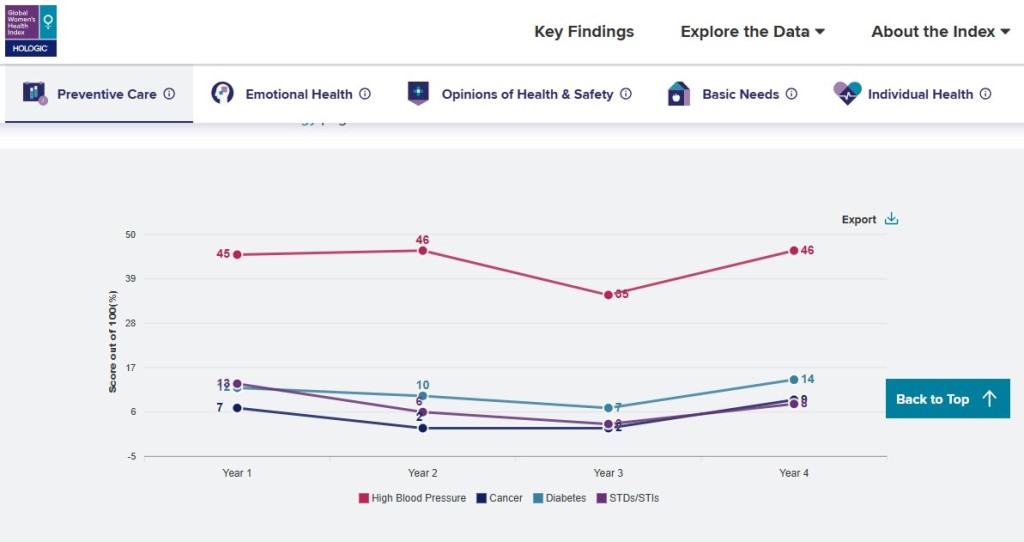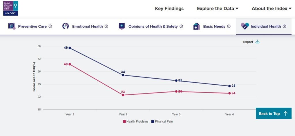 В показателе по индивидуальному здоровью страны ранжируются на основе опыта женщин, связанного с проблемами по здоровью. Оценка проводится путем опроса о том, испытывали ли они боль в течение последнего дня или имеют ли заболевания, которые мешают им выполнять повседневные действия.