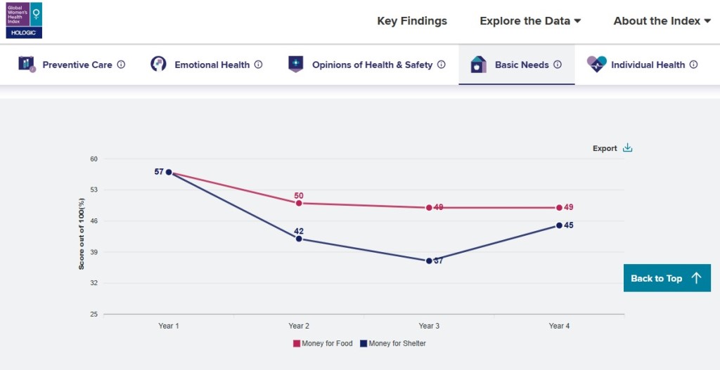 Данные по базовым потребностям основываются на способности женщин обеспечивать эти потребности за последние 12 месяцев, включая возможность купить еду для своей семьи и обеспечить ее жильем.