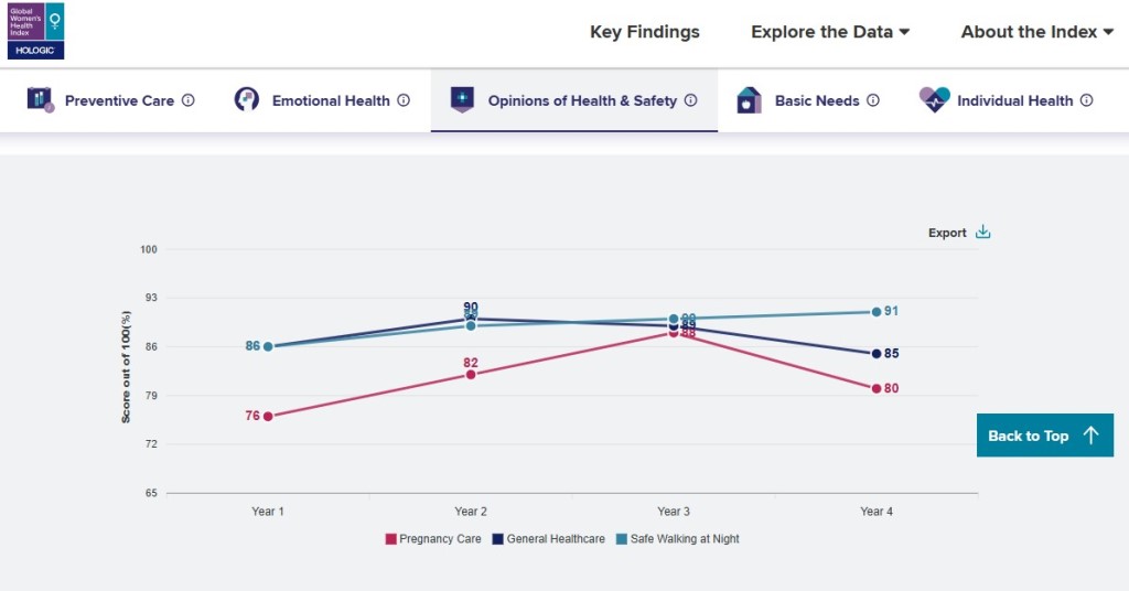 Оценка здоровья и безопасности основывается на удовлетворенности женщин доступом к качественному медицинскому обслуживанию в целом, их мнения о качестве медицинской помощи для беременных, а также чувства безопасности при прогулке в одиночестве ночью.