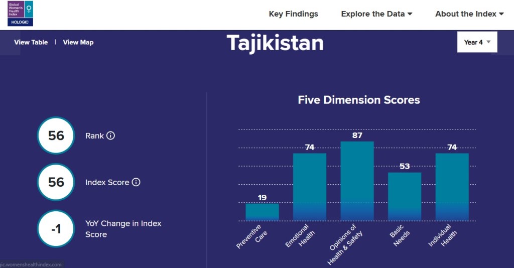 Компания Hologic опубликовала Глобальный индекс женского здоровья, в котором приняли участие 146 тыс. женщин из 142 стран и территорий. Таджикистан в рейтинге занял 56 место и, как указывают авторы, по некоторым показателям у страны есть улучшения.