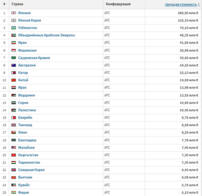 Первое место в Азии по дороговизне футболистов занимает Япония. Футболистов сборной Японии оценили в 286,9 млн евро. Второе место занимает Южная Корея — 122,10 млн евро.
