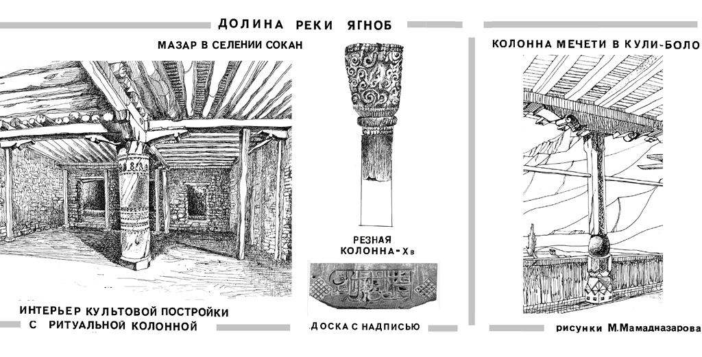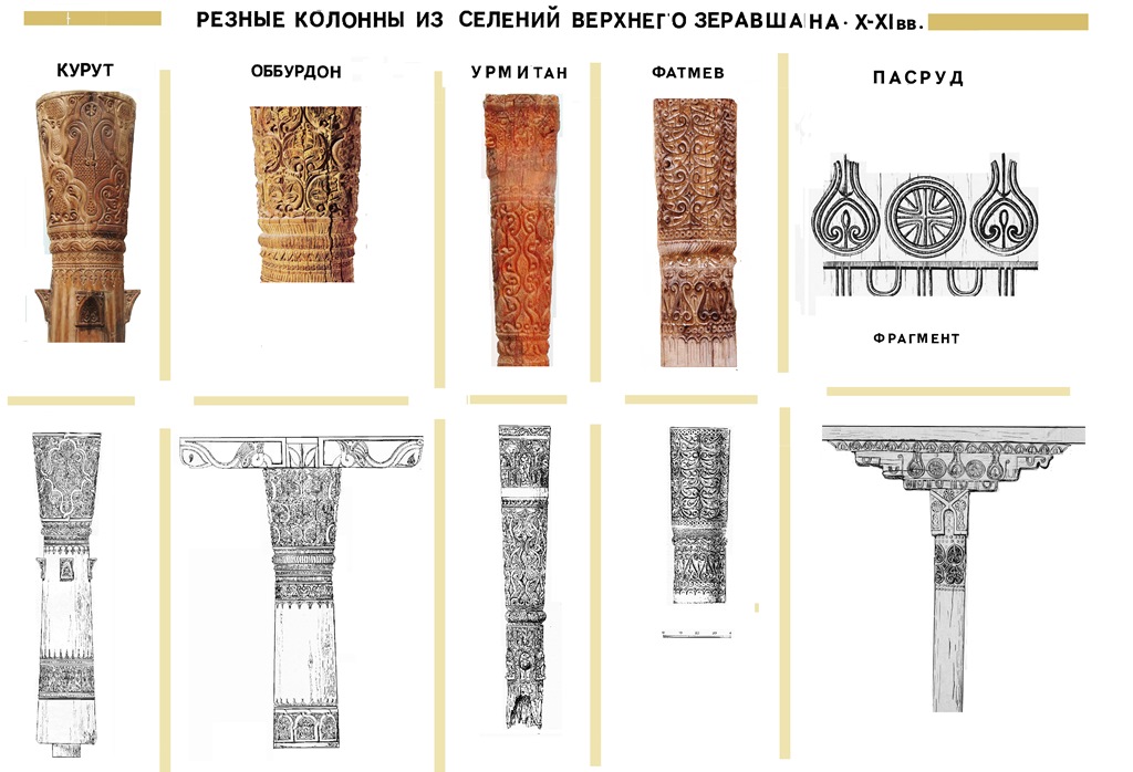 В орнаментальное убранство орнаментов изящно вплеталась вязь коранических надписей. Так случилось, что самые ранние образцы образцов резного дерева Центральной Азии X-XI вв были обнаружены в 1920-30-е гг. в верхнезеравшанских селениях Таджикистана – Курут, Оббурдон. Эти находки были сенсационными и, как считалось тогда, единичными. Но в 1946-1947 Согдийско-Таджикская экспедиция обнаружила в селениях Фатмев, Урметан, Рарз, Пасруд и Зосун новые резные колонны X-XII вв. которые демонстрируют ранние этапы формирования стиля и техники резного дерева.