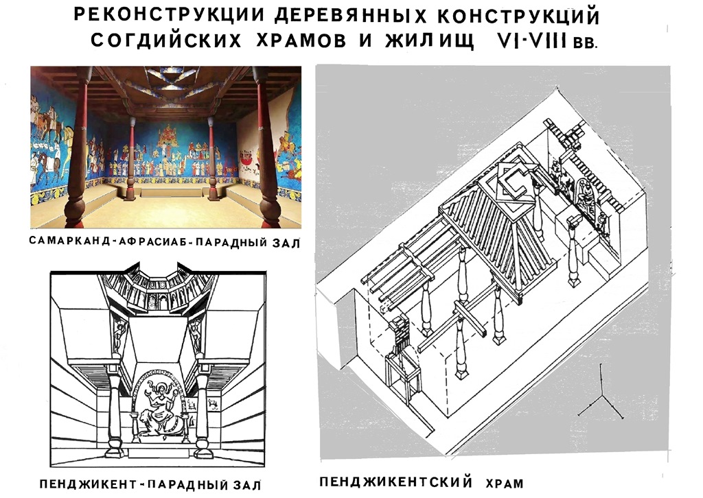 Особо следует отметить богатое декоративное убранство парадных залов древнего Пенджикента. Высокие четыре колонны в центре зала, украшенные резными капителями, подхватывали сложные резные деревянные конструкции перекрытия, которое представляло собой различные вариации сложного ступенчатого деревянного потолка со световым люком в вершине.