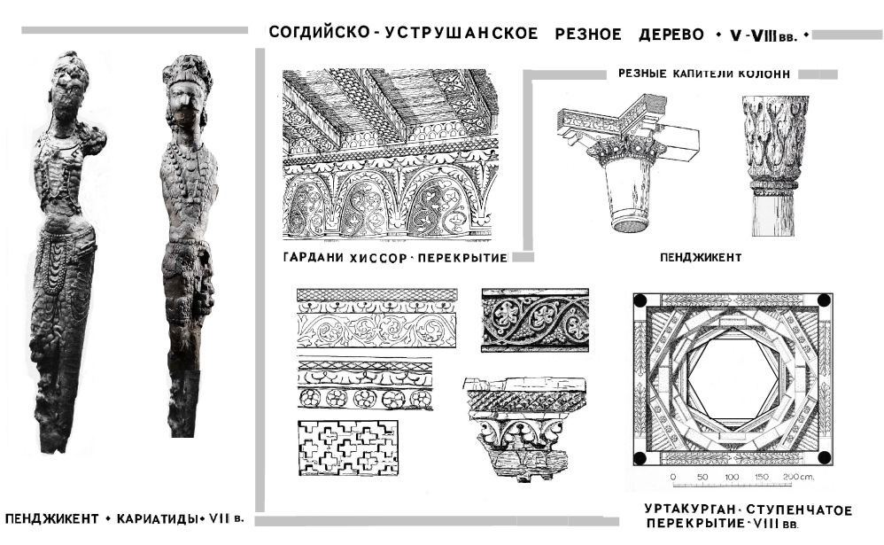 Благодаря археологическим изысканиям 1930-1980-х гг. мы имеем представление об искусстве резьбы по дереву VI-VIII вв. – время проживания наших восточноиранских предков. Это период наивысшего расцвета Шелкового пути, связывавшего неповторимые цивилизации европейского и ближневосточного Средиземноморья через Центральную Азию с Дальним Востоком.