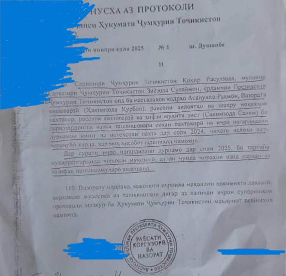 В копии протокола, на который ссылаются местные власти и который стал доступен редакции, говорится, что «премьер-министру, заместителю премьер-министра, помощнику президента по кадровым вопросам, министру сельского хозяйства, главам областей, городов и районов и т.д. поручено, с учетом тревожной ситуации в хлопководческой отрасли и невыполнения плана по посеву и производству хлопка в 2024 году, принять меры для исправления ситуации и ежемесячно предоставлять отчеты».