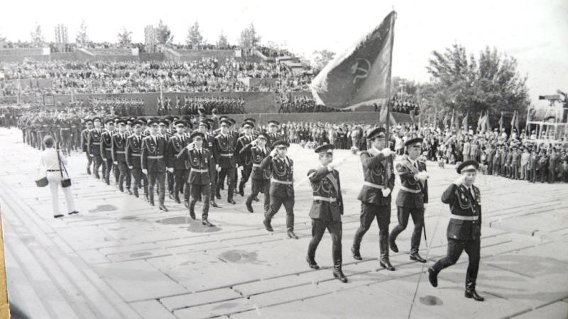 В сопровождении почетного эскорта мотоциклистов, в окружении боевых знамен частей 201-й мотострелковой дивизии, горящий факел везли на бронетранспортере к парку Победы герои Советского Союза Урунбек Якибов и Вениамин Недошивин.