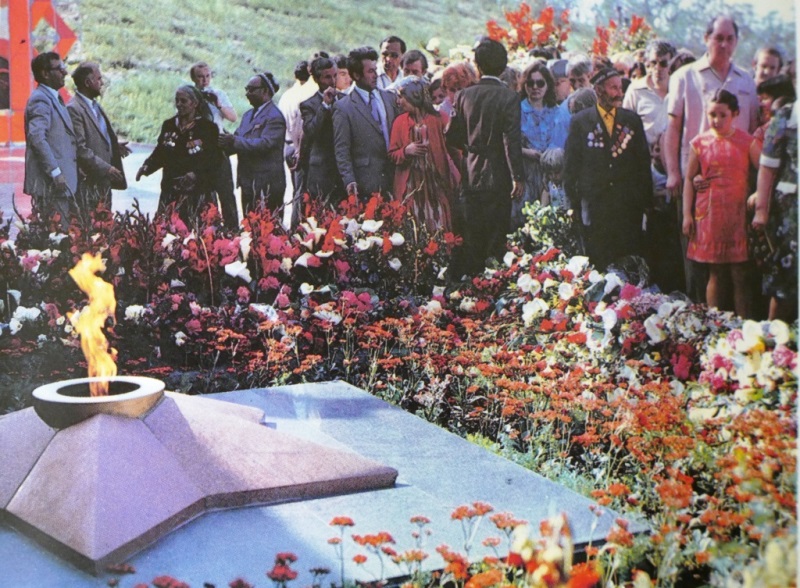 Вечный огонь зажёг глава Советского Таджикистана, первый секретарь ЦК Компартии Таджикской ССР Джаббор Расулов, принявший факел от Героя Советского Союза Урумбека Якибова.