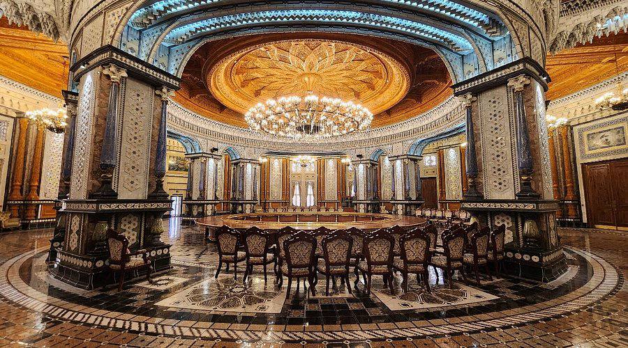 Здесь всё поражает масштабом и изяществом: залы с гипсовыми орнаментами, полы из мозаики и паркета с национальными узорами, огромные люстры из египетского хрусталя и бесконечные коридоры, открывающие виды на террасы и купола.