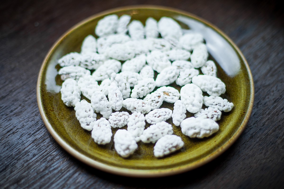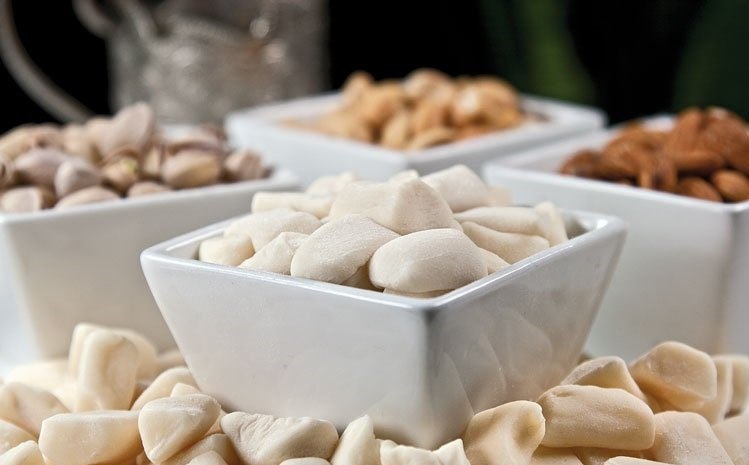Кандалот представляет собой отдельные ядра миндаля удлиненной формы покрытого сахарным сиропом белого цвета с бугристой поверхностью.