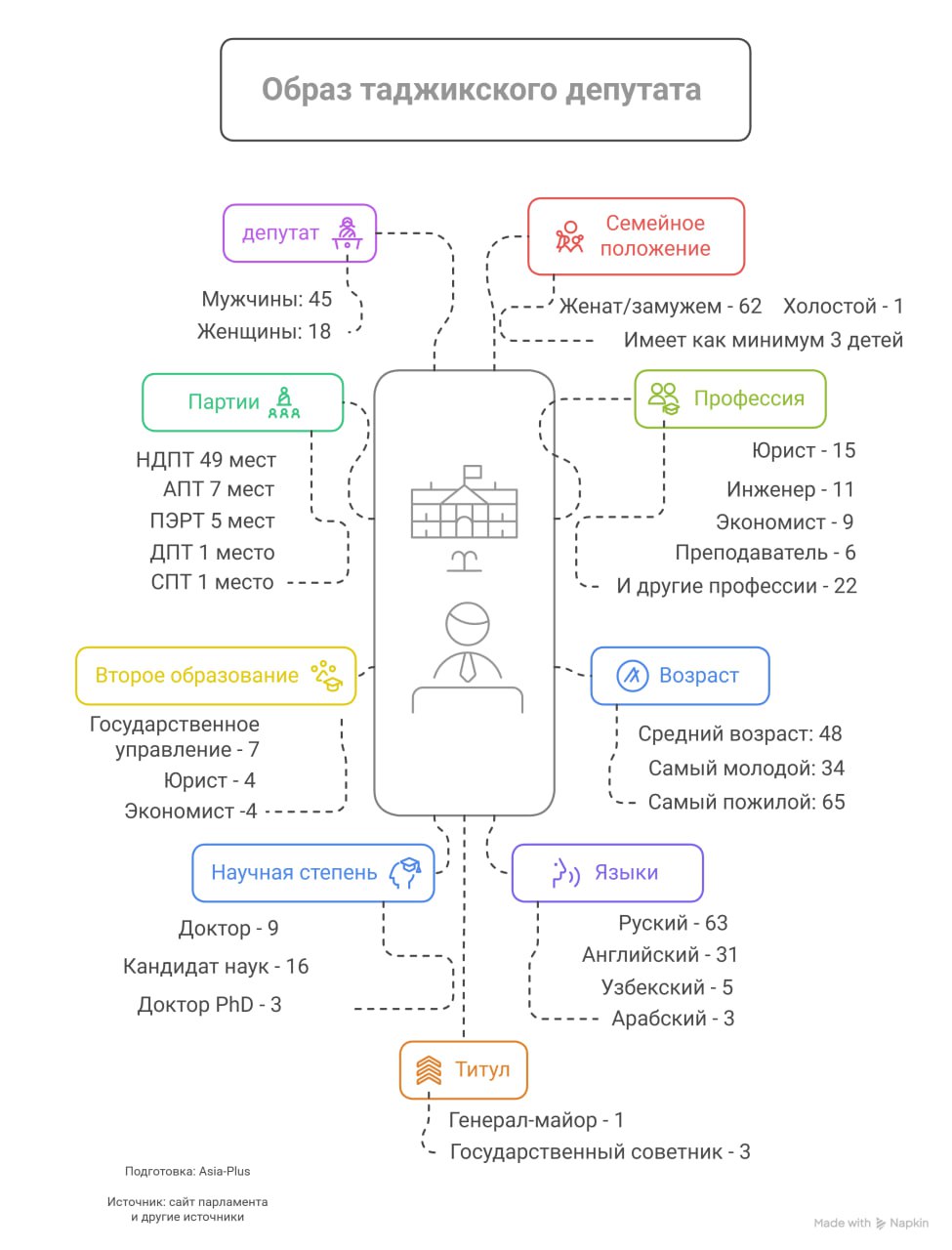 Анализ информации о депутатах последнего созыва парламента Таджикистана рисует образ успешной личности в жизни и политике — энергичного депутата с высшим образованием (возможно, с двумя высшими образованиями), который знает хотя бы один иностранный язык (возможно, два или три), возможно, является кандидатом наук или доктором, имеет семью и несколько детей.