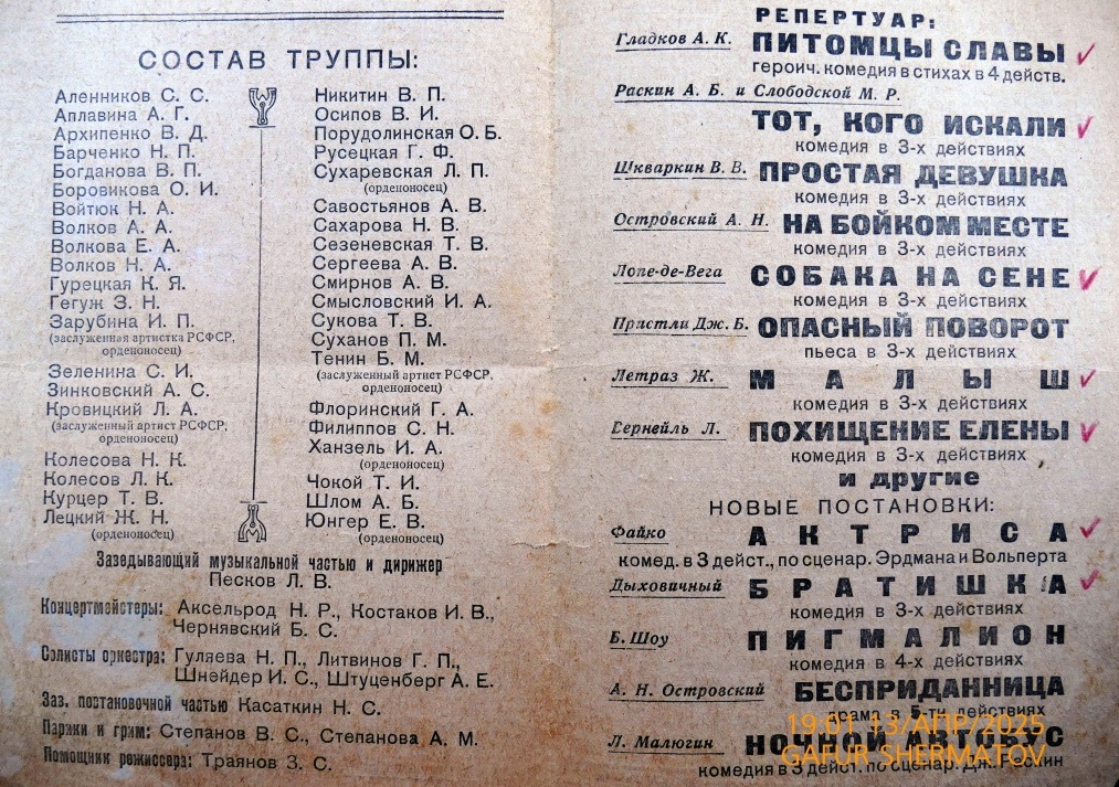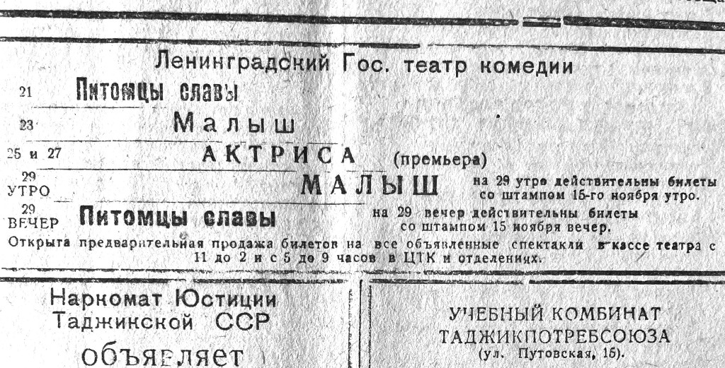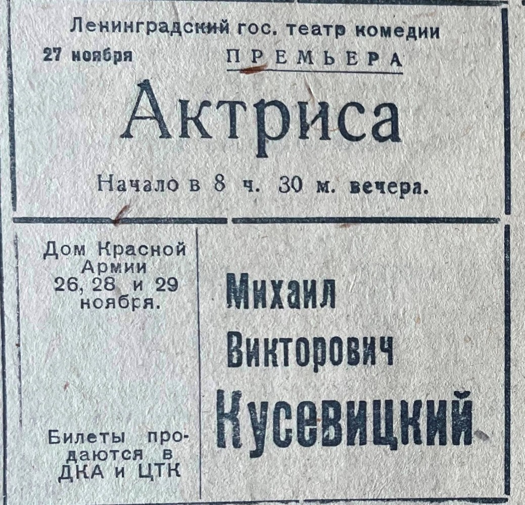 Тогда было решено создать спектакль на основе киносценария Н. Эрдмана и М. Вольпина «Актриса». Переработку сценария для сцены взял на себя драматург А. Файко, находившийся в Таджикистане. Труппа активно готовилась к обновлению афиши. Репертуарные задачи приходилось решать, учитывая оторванность театра от драматургов.