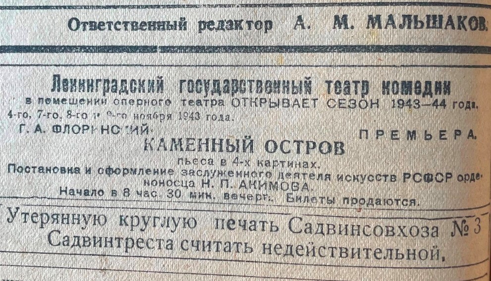 В 1943 году ленинградцы представили в Сталинабаде семь премьерных спектаклей: «Братишка» В. Дыхановича, «Дорога в Нью-Йорк» Л. Малюгина, «Каменный остров» Г. Флоринского, «Пигмалион» Б. Шоу, «Не всё коту масленица» А. Островского, «Подсвечник» А. Мюссе, «Свадьба Кречинского» А. Сухово-Кобылина.