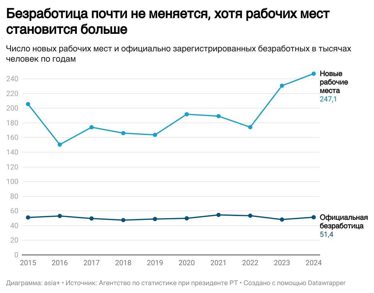 Более того, не увязываются с темпами роста количества рабочих мест численность занятого населения и безработных (рабочая сила). Число работающих людей за эти 10 лет выросло на 400 тыс. человек, а количество официально зарегистрированных безработных остается практически неизменным (51,1 тыс. – в 2015 году и 51,4 тыс. – в 2024 году).