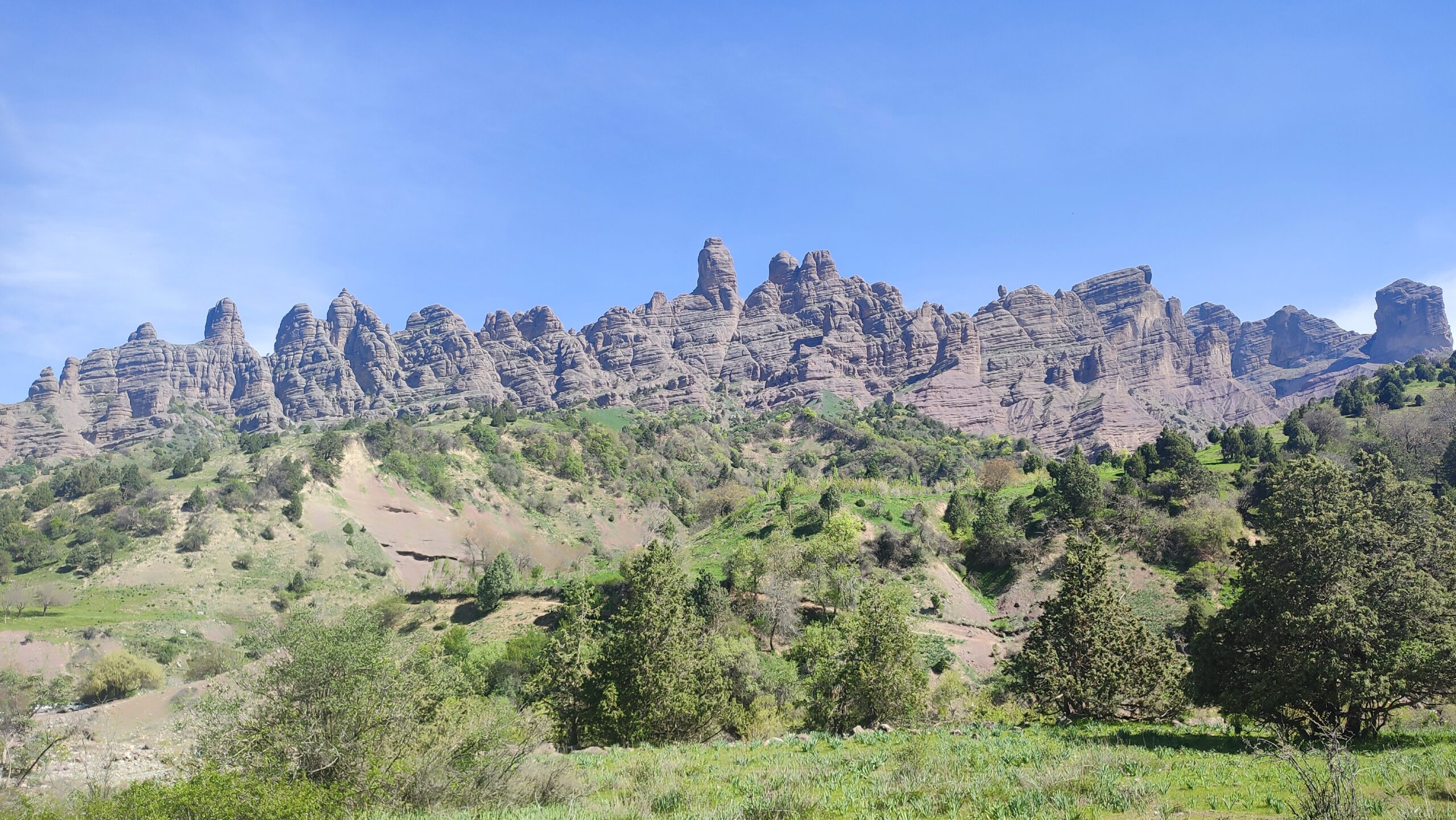 На второй день нашего путешествия мы отправились в удивительную местность Чилдухтарон, расположенную в районе Муминабад, на высоте более 2000 метров над уровнем моря. Это уникальное природное образование состоит из каменных структур высотой до 60 метров, напоминающих пирамидальные фигуры, выточенные временем и ветром.