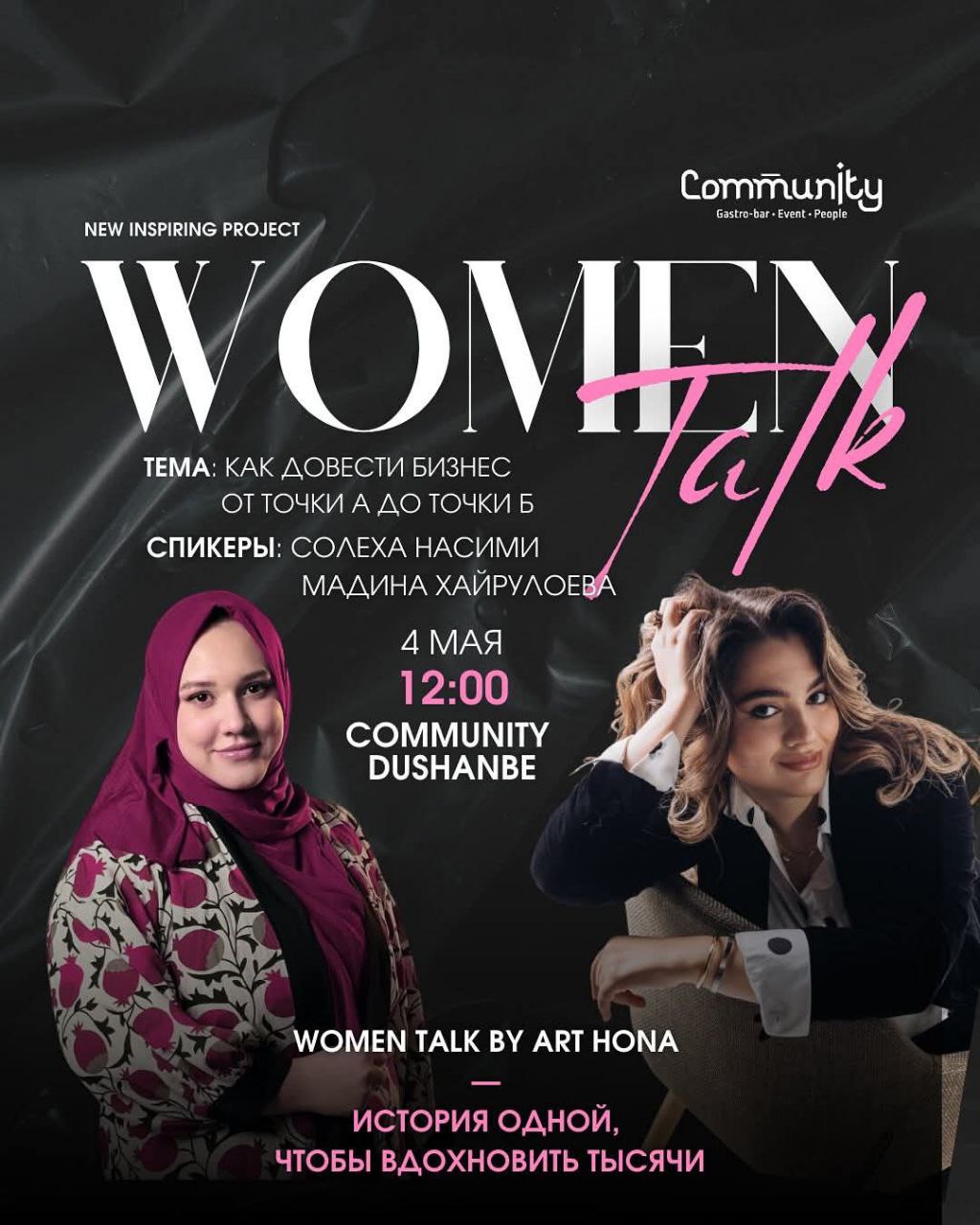 В Community Dushanbe 4 мая в 12:00 пройдёт вторая женская встреча от Art Hona АРТ. Здесь — только честные истории, вдохновение и поддержка. Тема: Как довести идею или бизнес от точки «А» до точки «Б» и не потеряться на этом пути.