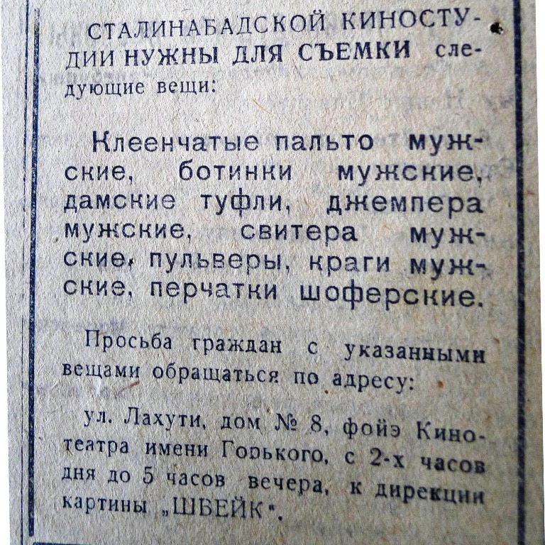 В Душанбе в то время находились и работали такие известные мастера советского кино: Зоя Федорова, Фаина Раневская, Борис Андреев, Эраст Гарин, Сергей Мартинсон, Николай Крючков, Рина Зеленная, Алексей Консовский, Сергей Филиппов, Янина Жеймо, Георгий Милляр, Иван Чувелев, Лидия Сухаревская, Сергей Столяров, Борис Тенин и др.