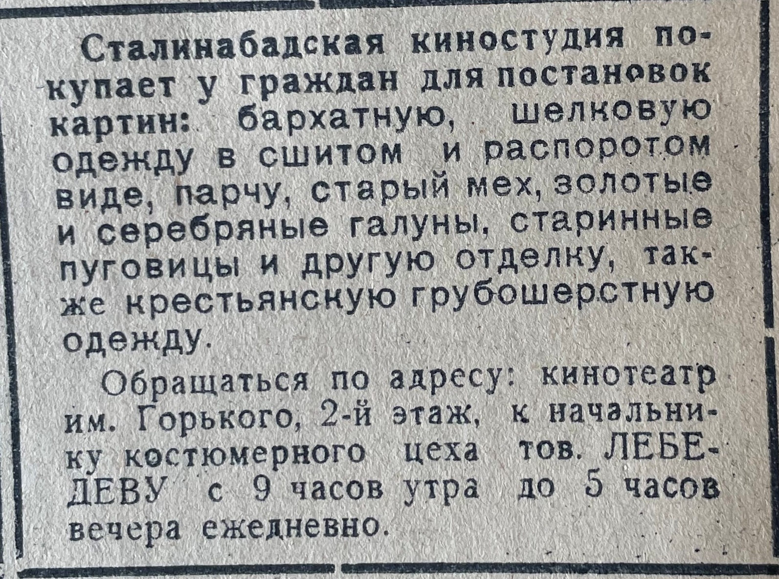 В Сталинабаде возобновили свою творческую деятельность кинорежиссеры: основоположник теории монтажа Лев Кулешов, Александр Роу, которого справедливо называют первым киносказочником страны, Яков Протазанов, пионер русского кинематографа и другие.
